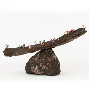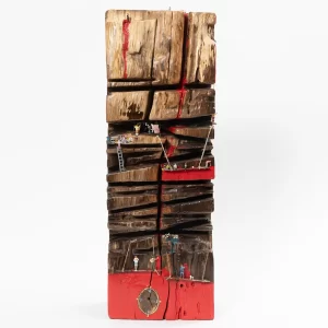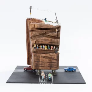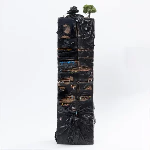 | Materialidad | Madera, figuras, bolsas negras y técnica mixta |