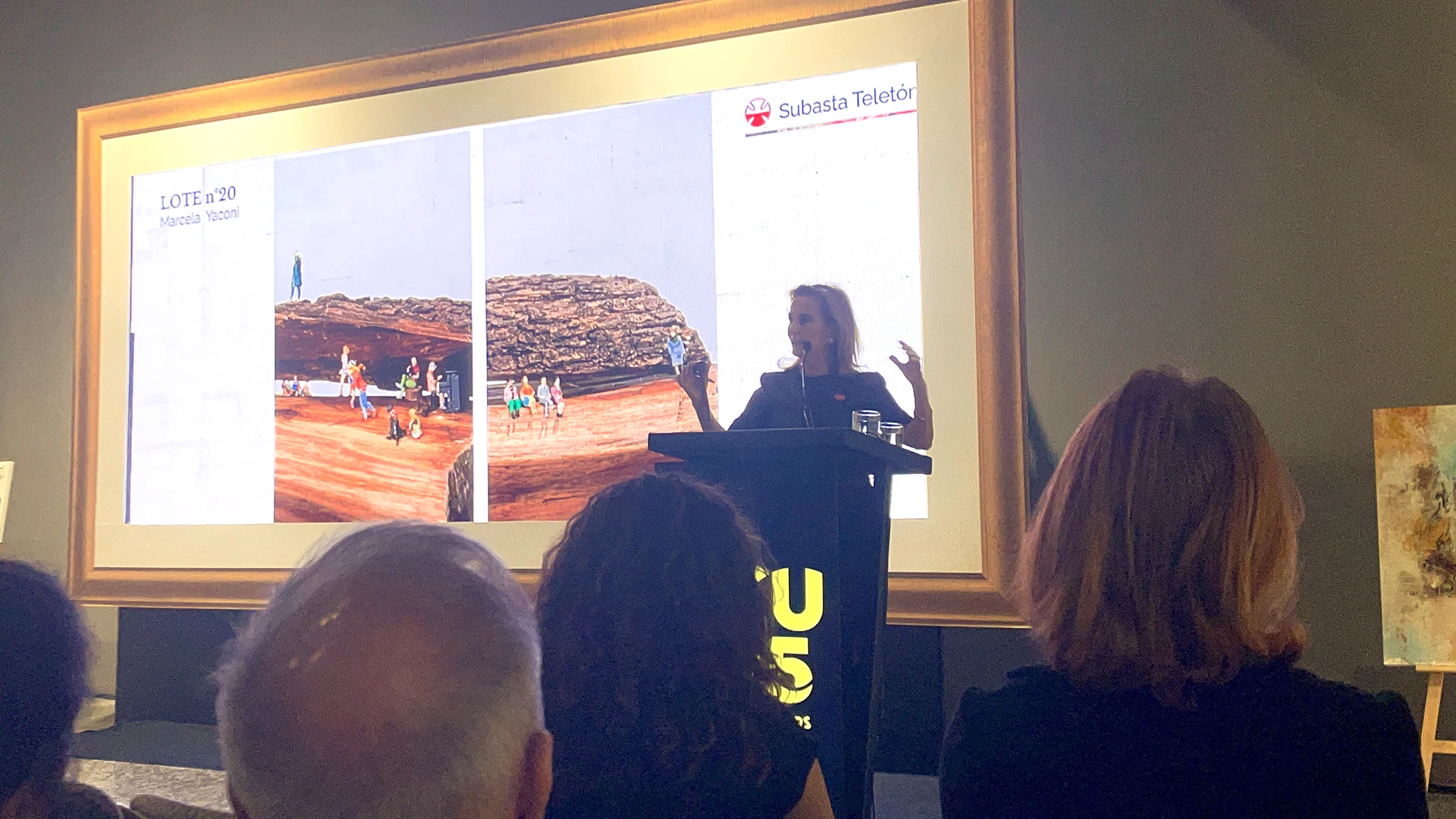 En la foto principal, Denise Ratinoff rematando la obra donada por Marcela Yaconi, “Bajo Techo“.