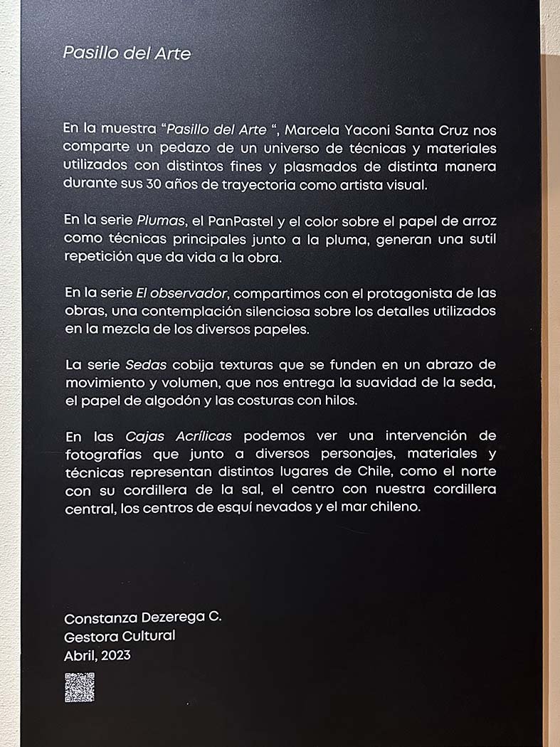En la muestra “Pasillo del Arte “, Marcela Yaconi Santa Cruz nos comparte un pedazo de un universo de técnicas y materiales utilizados con distintos fines y plasmados de distinta manera durante sus 30 años de trayectoria como artista visual.