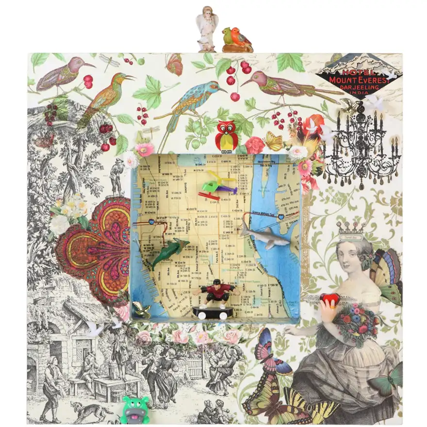 | Materialidad | Encuentro de varios materiales: papeles, juguetes, personajes, objetos, elementos recolectados que forman parte de un todo. |