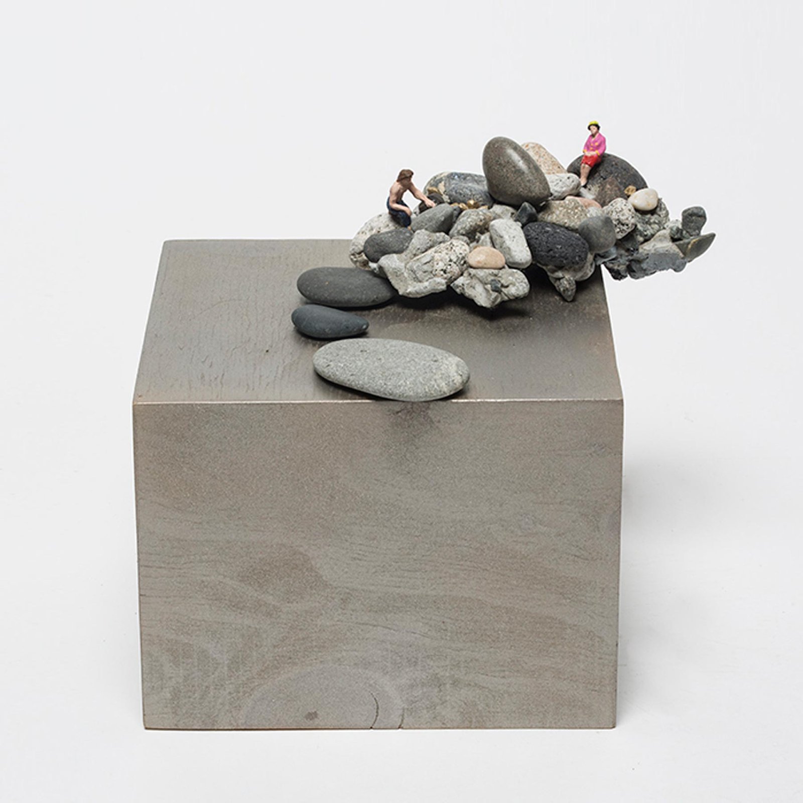 Materialidad Figuras y piedra sobre base de madera de pino terciada intervenida