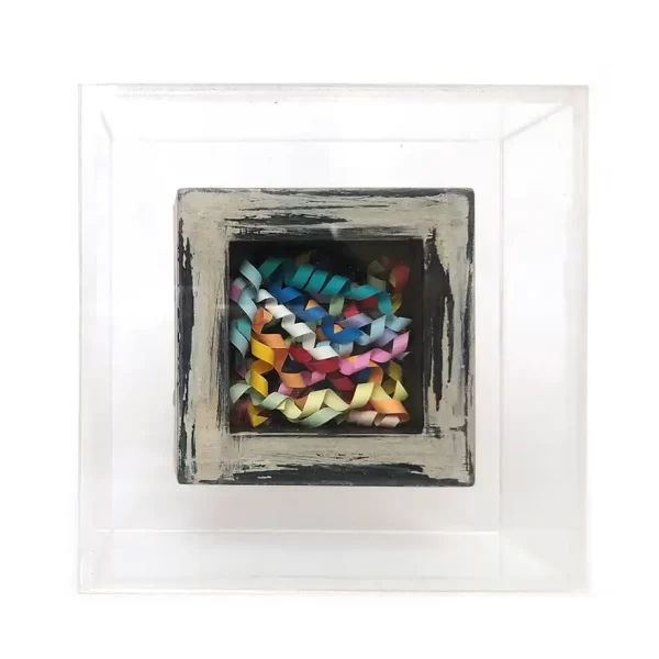 | Materialidad | Cintas insertadas en marco de madera retocado, inserto en caja de acrílico transparente. |