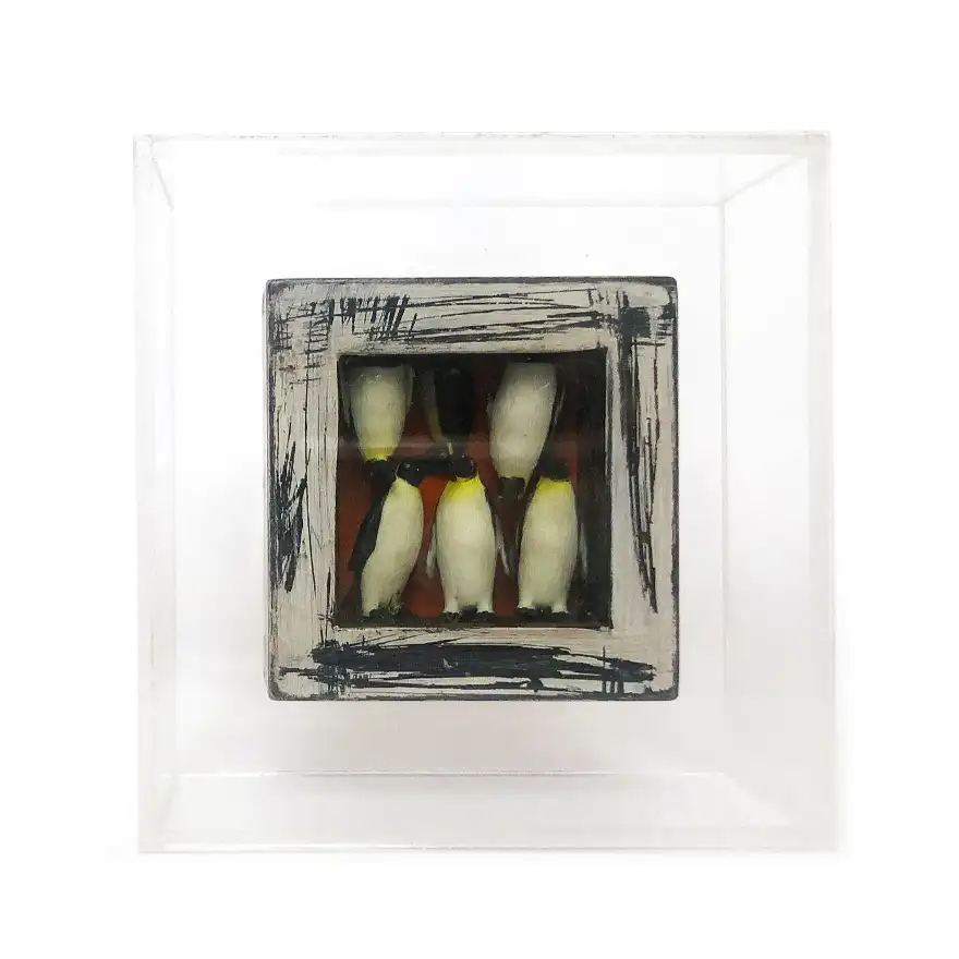 | Materialidad | Figuras de pinguinos insertados en marco de madera retocado, inserto en caja de acrílico transparente. |