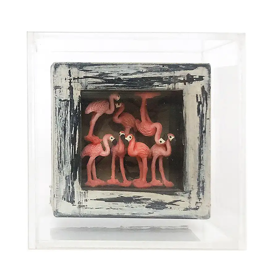 | Materialidad | Figuras de flamencos insertadas en marco de madera retocado, inserto en caja de acrílico transparente. |