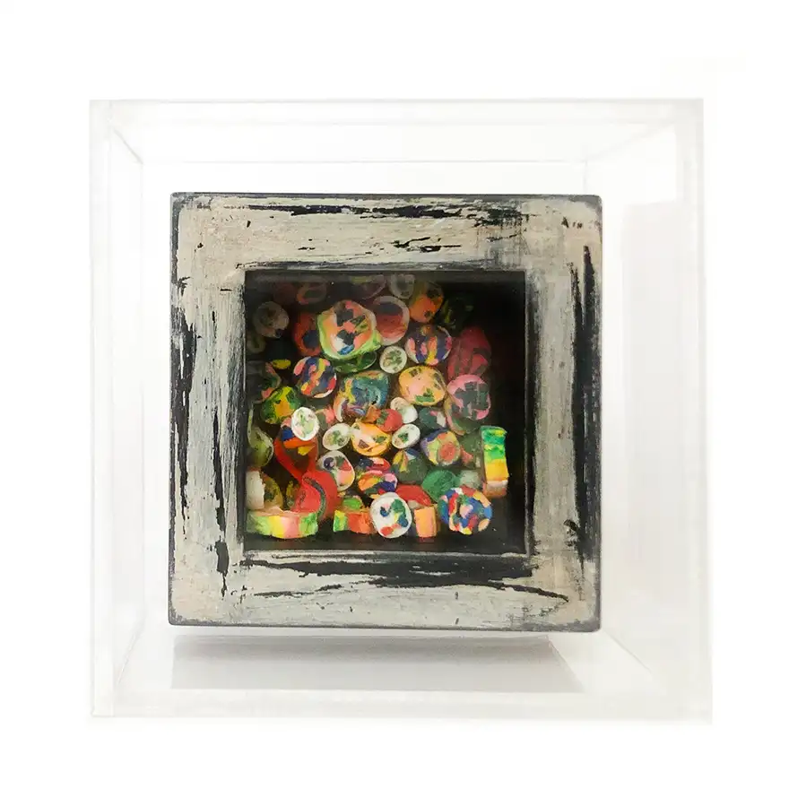 Materialidad Figuras con técnica mixta insertada en marco de madera retocado, inserto en caja de acrílico transparente.