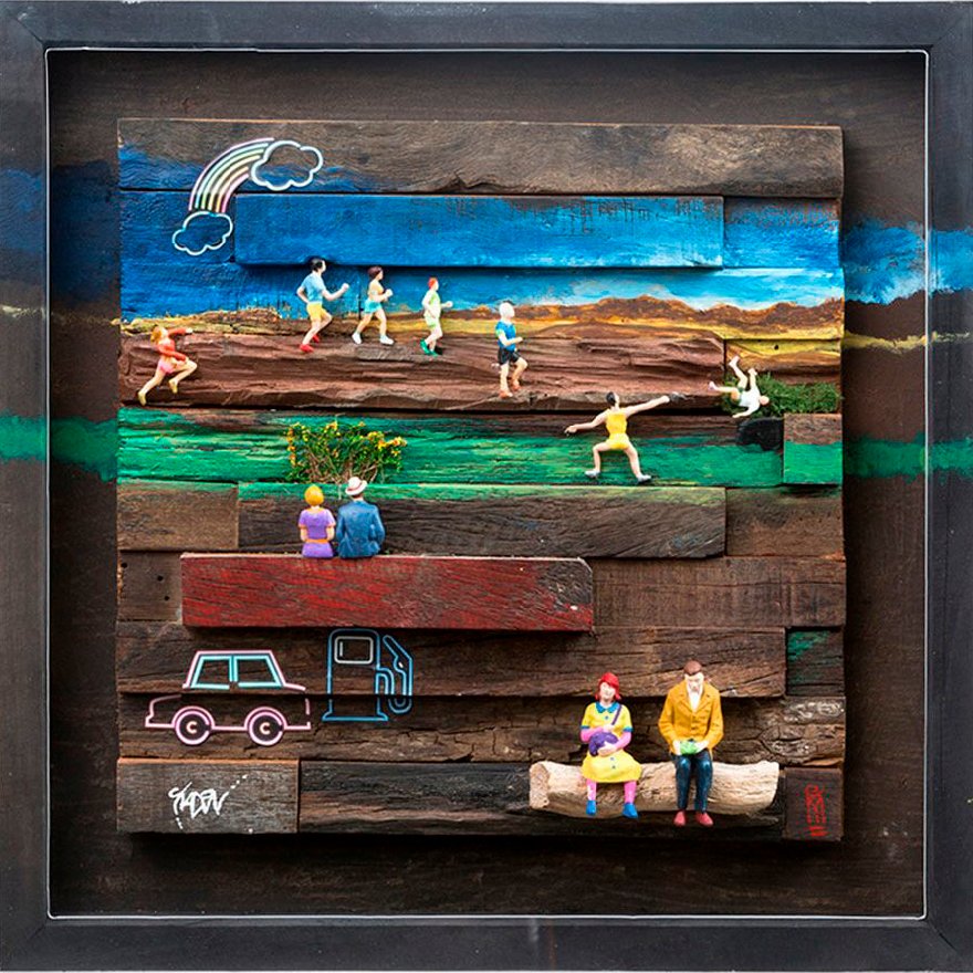 | Materialidad | Figuras con técnica mixta insertada en marco de madera retocado, inserto en caja de acrílico transparente. |