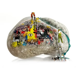 | Materialidad | Figuras pintadas sobre piedra y técnica mixta |